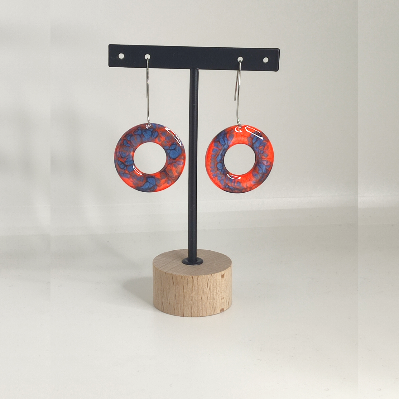 boucles d'oreilles ronde orange fluo et bleu nuit longueur 6 cm