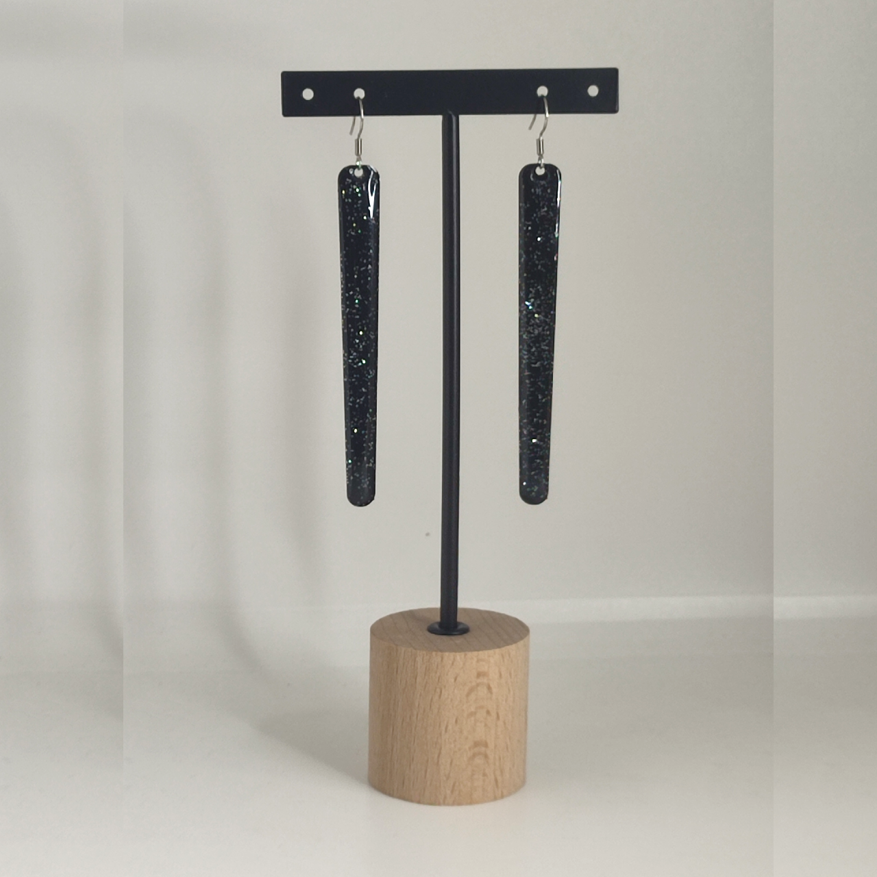boucles d'oreilles tige noir paillette argent longueur 10 cm